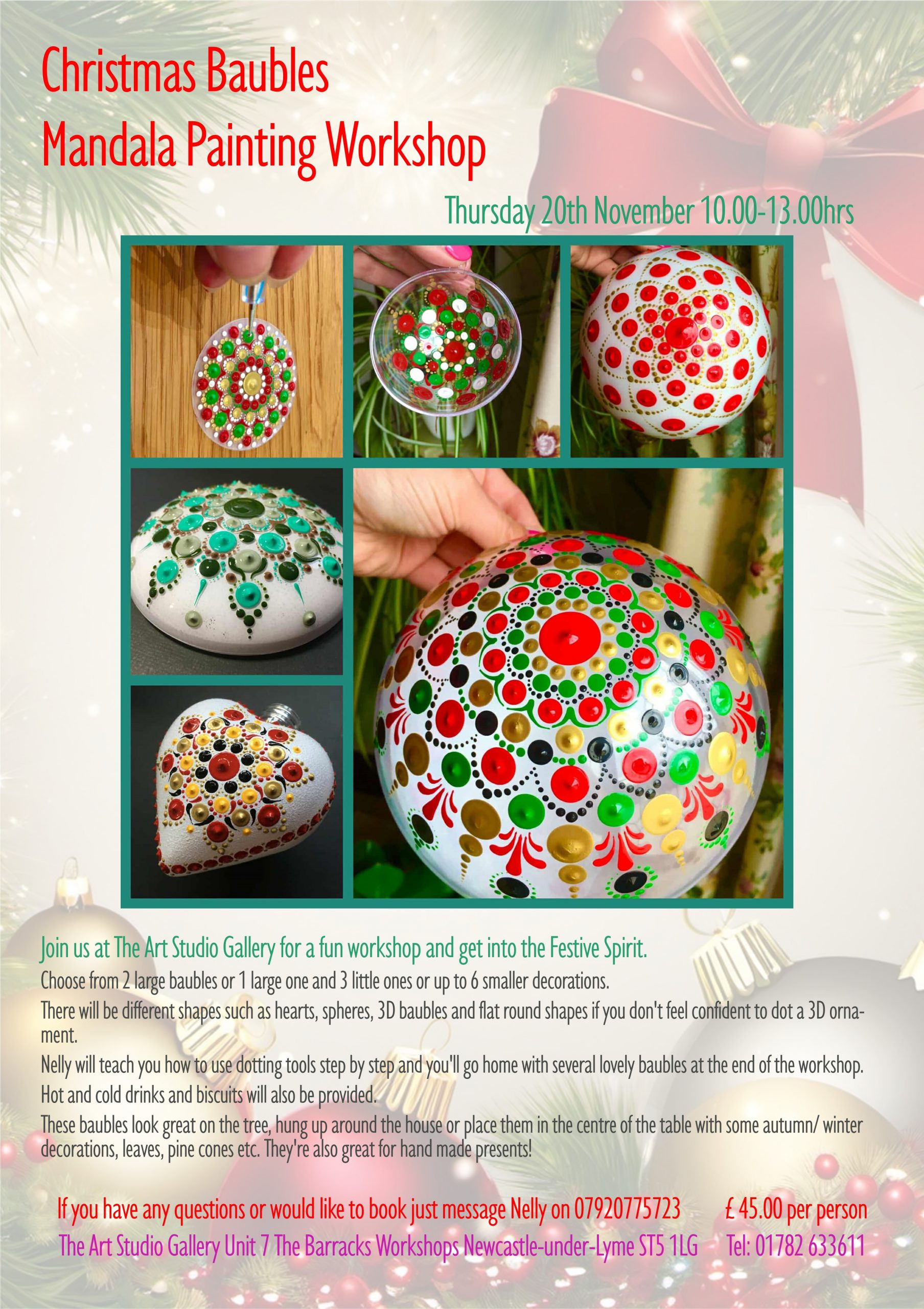 Mandala Painting – Christmas Bauble Workshop – Thursday 20th November 2025 10am – 1pm – Spaces limited – Click the link to book. £45 per person 20th Nov., 10-1pm: Christmas baubles mandala painting – MandaLove by Nelly